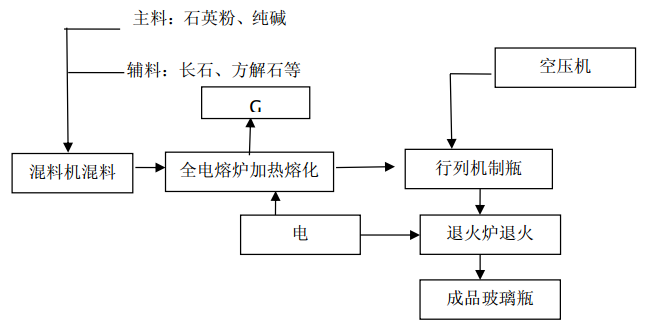 原料在混料機(jī)中進(jìn)行混合后進(jìn)入全電熔爐內(nèi)熔化,熔化好的玻璃液在成型工段進(jìn)行吹制成型,成型后的玻璃瓶進(jìn)入退火爐退火,退火完成后的玻璃瓶在經(jīng)過質(zhì)檢篩選后送入倉庫。